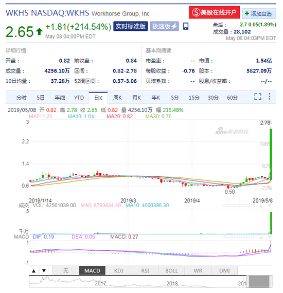 新浪美股讯 周三,美国总统特朗普的一条推文推动低价股Workhorse飙升,这家总部位于俄亥俄州的电动汽车制造商的股价一度上涨228%。该股周三开盘报0.82美元,收盘至2.65美元,涨幅达214%,盘中两度触及熔断。