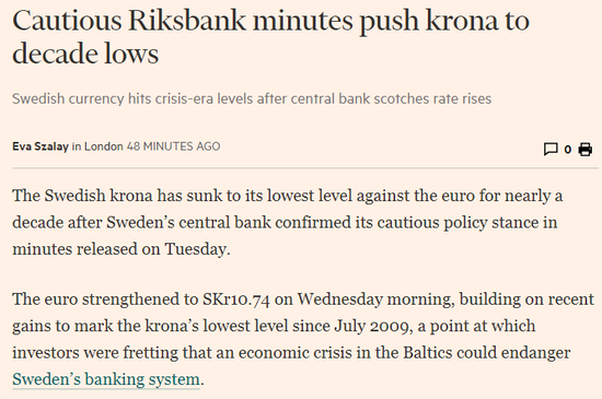 瑞典克朗兑欧元汇率跌至近10年来最低水平,此前瑞典央行在周二公布的会议纪要中确认了其谨慎的政策立场。