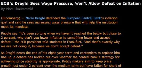 马里奥·德拉吉捍卫了欧洲央行的通胀目标,并表示他看到工资压力正在增加,将有助于该机构达成其职责目标。