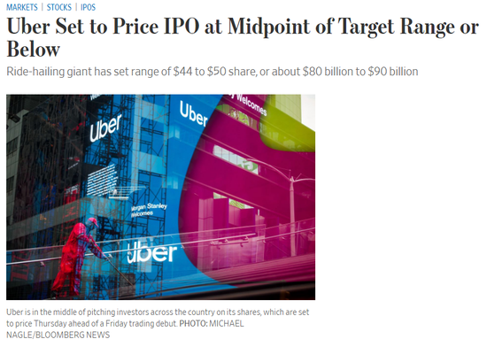 据知情人士透露,Uber的首次公开募股(IPO)定价预计位于或低于目标价的中点,此前美国股市大幅下跌,且其竞争对手Lyft上市以来的表现令人失望。