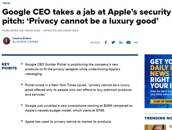 随着“隐私”成为硅谷的新流行语,谷歌首席执行官桑达尔-皮查伊(Sundar Pichai)开始定位自己公司的新产品,以适应时代潮流,同时削弱竞争对手的舆论攻势。
