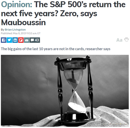 根据一个在过去65年中得到证明的公式,蓝山资本管理公司(BlueMountain Capital Management)研究主管迈克尔-莫布森(Michael Mauboussin)在一份新的白皮书中预测,从现在到2023年底,标准普尔500指数的总回报率(包括股息)将为零。