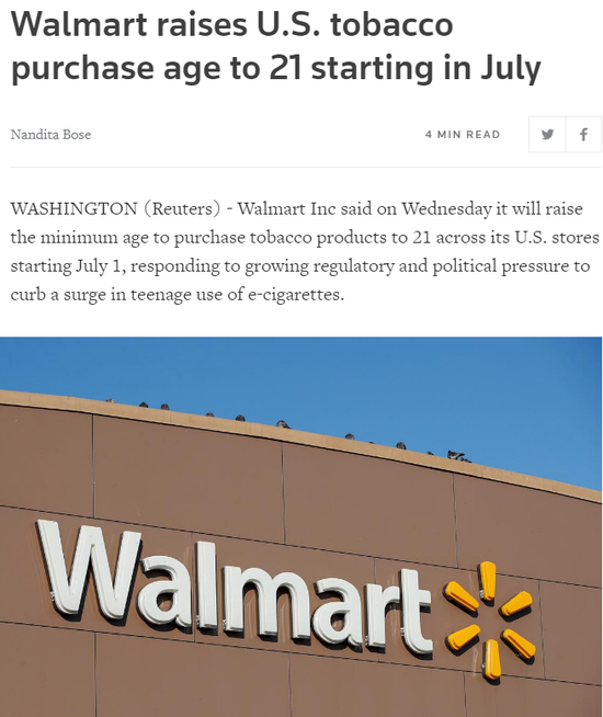 沃尔玛(Walmart)表示,由于监管机构和其他努力限制儿童和青少年吸烟的机构施加压力,该公司将把所有门店购买烟草产品的最低年龄提高到21岁,并将停止销售水果味电子烟。