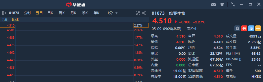 智通财经APP获悉,维亚生物(01873)首日挂牌,截至9时20分,涨2.27%%,报价4.51港元,成交额2.26亿港元。