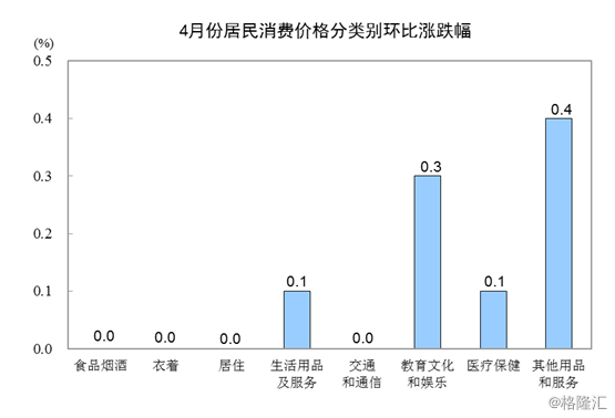 4月份,全国居民消费价格环比上涨0.1%。其中,城市和农村均上涨0.1%;食品价格下降0.1%,非食品价格上涨0.1%;消费品价格与上月持平,服务价格上涨0.2%。