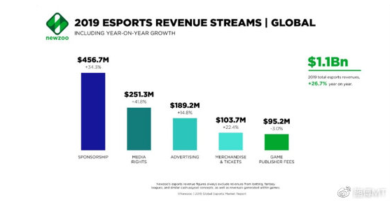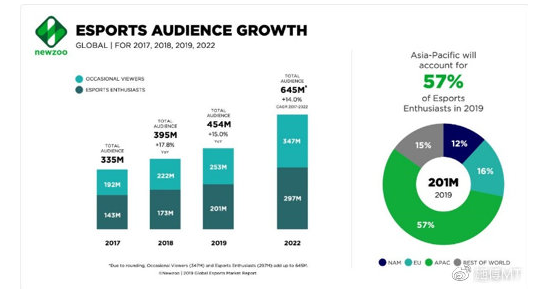 跟据电子竞技研究机构 Newzoo 发布了《2019年全球电子竞技市场报告》,预计2019年全球电子竞技行业营收将达到11亿美元 (图一),而电竞比赛的观众数将会由2017年335万人次提升2018年395万人次,2019年更预计有454万人次(图二)。这是一个巨大的产业,是一块投资的肥肉。