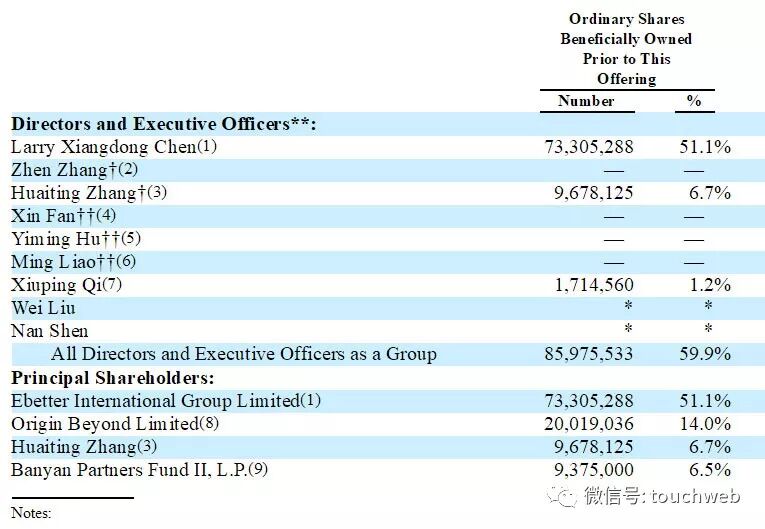IPO前,陈向东持股为51.1%,为公司最大股东;张怀亭持股为6.7%。Xiuping Qi持股为1.2%。