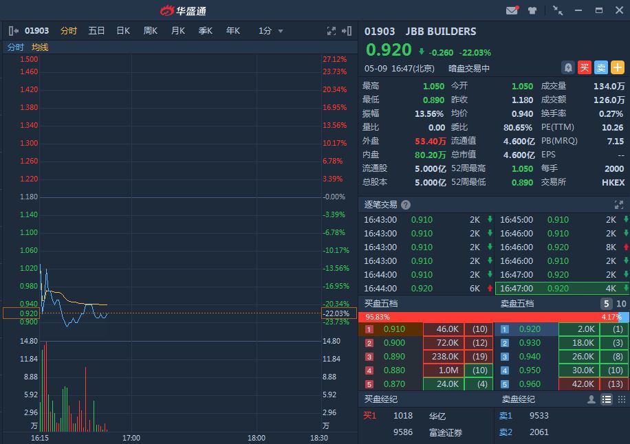 JBB BUILDERS暗盘暂报0.92港元,较发行价1.18港元跌22.03%,暂成交126万港元,最新总市值4.6亿港元。
