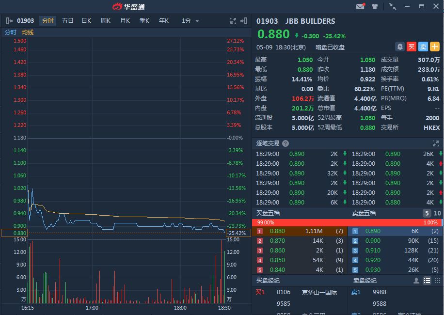 JBB BUILDERS暗盘收报0.88港元,较发行价1.18港元跌25.42%,每手赔600港元,成交额达到283万港元,总市值为4.4亿港元。