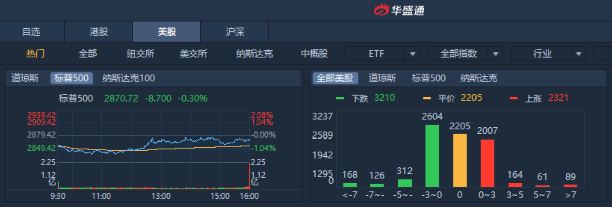 周四,美股盘中大跌后,跌幅收窄。标普500连续第四个交易日下跌,收跌0.30%,报2870.72点,创4月2日以来收盘新低。道指收跌0.54%,报25828.36点。纳指收跌0.41%,报7910.59点。