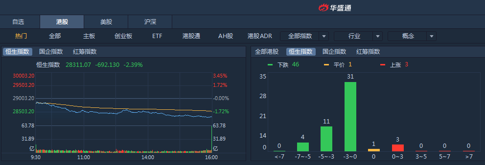 周四,恒指早盘低开,午后开盘稍有反弹,随后继续走低,跌幅创近两月新低。截至收盘,恒生指数跌2.39%,报28311.07点,全日成交额达1218.02亿。国企指数跌2.27%,报10845.06点,红筹指数跌2.09%,报4374.76点。