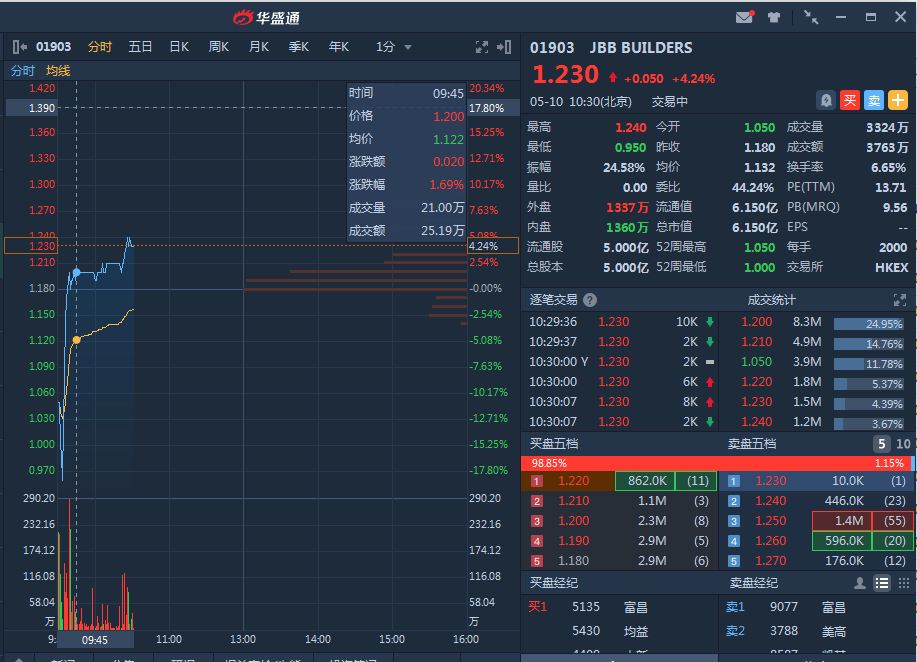 JBB BUILDERS今日首日挂牌,股价盘中宽幅波动,截至10时30分,涨4.24%,报价1.23港元,成交额3763万港元。