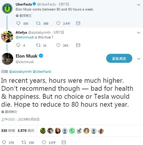 如图所示,有网友问马斯克,他每周的工作时间是在80小时至90小时之间吗?