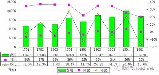 京东第一季度费用为169.78亿元,较上年同期的141亿元增长20%,较上一季度的201亿元降低15.6%。