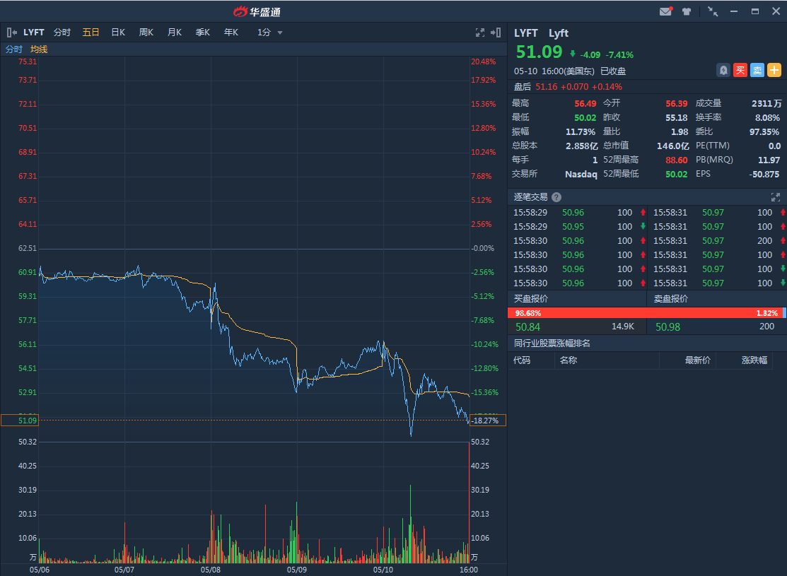 北京时间5月11日晚间消息,网约车第一股Lyft盘中竞Lyft一度跌超9%。截止北京时间00:06,跌3.61%,报53.19美元。按当前价计算,市值为153.59亿美元。