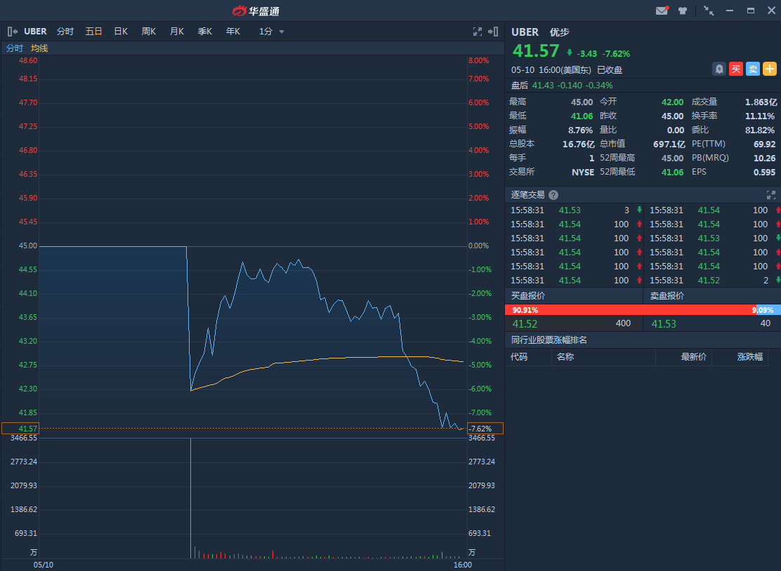 其竞争对手,Uber美国IPO首日开盘报42美元,跌破发行价45美元,计划通过IPO发行1.8亿股普通股。按照开盘价计算,Uber市值达到756亿美元。