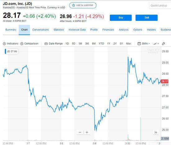 最终,京东收涨2.4%,收报28.17美元,收创本周一以来新高,创4月29日以来最大收盘涨幅。截至周五收盘,京东股价今年以来累涨超过32%。不过,从最新行情看,京东财报带来的刺激可能不会延续到下周一,截至最近更新,京东股价盘后一度跌超4%。