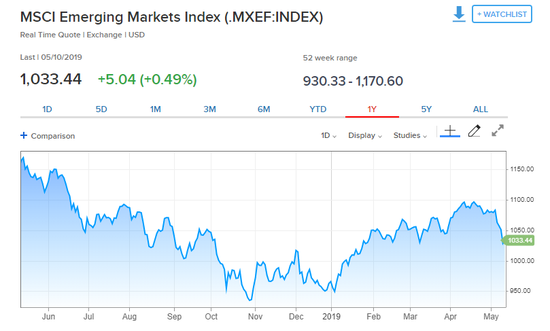5月10日周五,MSCI新兴市场指数上涨0.49%,报收1033.44点。本周一至周四,该指数连续四个交易日下挫,其中周四更是大跌1.8%。