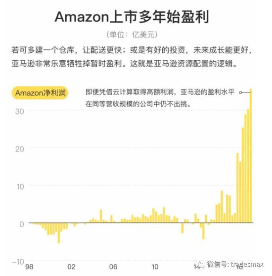 在上市之初,亚马逊因为长期未盈利不被华尔街看好。但即便投资人不买账,亚马逊仍然野心勃勃拓展战线,意图超越竞争者。若可多建一个仓库,让配送更快;或是有好的投资,未来成长能更好,亚马逊非常乐意牺牲掉暂时盈利。这就是亚马逊资源配置的逻辑。