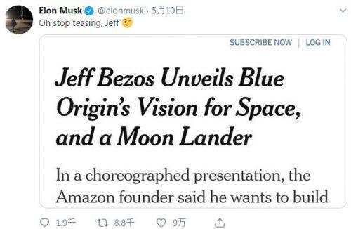 5月11日消息,据美国财经网站CNBC报道,当地时间周四,亚马逊董事长、蓝色起源(Blue Origin)创始人杰夫·贝佐斯(Jeff Bezos)首次展示了其太空公司的月球着陆器。之后,埃隆·马斯克(Elon Musk)以一种相当粗鲁的方式对其嘲笑了一番。