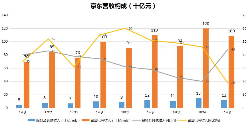 按照属性,京东营收可分为两大块:自营业务取得的销售收入;服务收入,即为开放平台第三方卖家提供服务(如广告、物流等)收取的费用。本季度京东实现了自营电商收入1090亿元,同比增长19%。而服务以及其他收入则达到124亿元,同比增长44%。观察上图可以看到自营业务增速放缓明显,但服务收入增速大幅提高,这与从17年Q4开始就更为重视第三方业务有关。