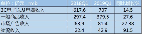 从收入细分占比来看,京东自营仍以电器为主要品类。2019年电器以及3C收入为707亿元,同比增14.5%,占总收入比重58.4%,从2015年初的占比80%一直在下降。而一般商品收入(日用品)收入和市场广告收入同比增速达到27.6%和27.38%。最大的亮点当属物流收入,本季度同比增长91.5%,为4大收入增速最快的一项。CFO黄宣德在电话会议上也提到,由于在2018年2季度客户在享受了大半年优惠后,接受了物流的正常费率,所以直接促进了这项收入。