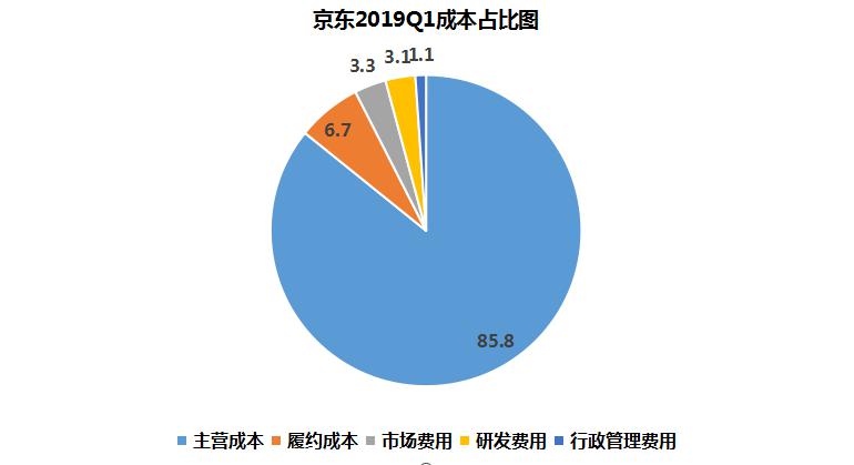 京东将成本主要分为主营成本、履约成本、市场成本、研发成本以及管理成本。这次财报中比较明显的还属于履约成本的下降。所谓的履约环节,包括采购、仓储、配送、客户服务和支付处理等,主要由京东物流来完成。从2019年第一季度数据来看,其占总收入的比例进一步下降到了6.7%。各项成本中,履约成本是增速最慢的一项成本,同比增速仅为12%,就连主营成本(卖货的成本)的增速都有20%。