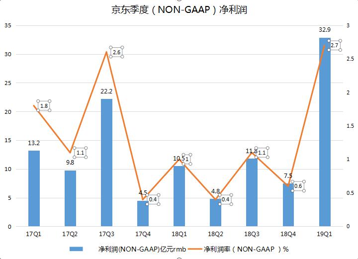 在成本压缩以及提升周转的情况下,这次2019Q1京东财报最大的亮点是利润。经营利润12亿元,净利润73亿元,非公认会计准则净利润33亿元,全部为正。但是上半部分提到,京东的重资产模式毛利率并不高,那么为何此次交出如