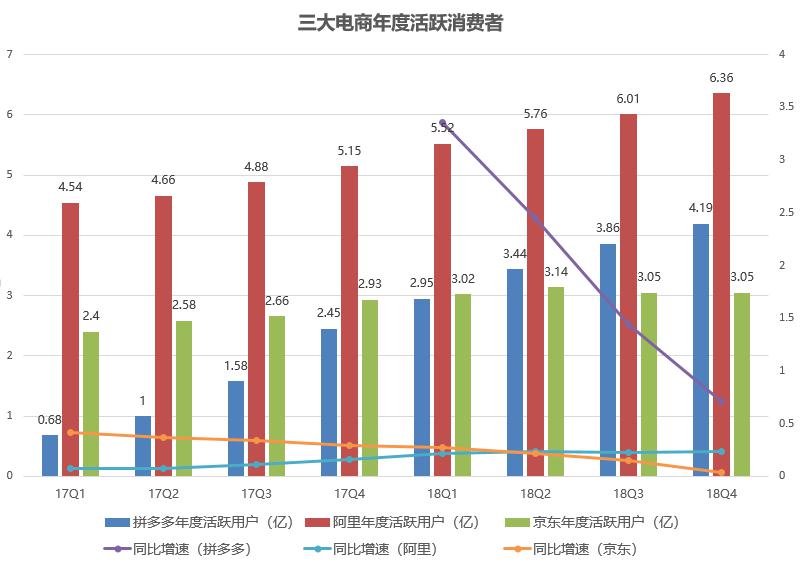 阿里2018年和2017年的活跃用户增速为26.63%和21.59%,凭借支付宝以及对四五线市场的电商渗透,阿里仍然获得了千万级的新客。拼多多平台2018年度活跃买家数达4.185亿,较2017年同期增长1.737亿,同比增幅达到71%。此外,拼多多APP在去年第四季度的平均月活用户数达2.726亿,同比增长93%。如果仅考虑年度活跃买家和月活数,拼多多已成为中国第二大电商平台。过去两年间,京东的活跃用户增速仅为2018年的4.38%和2017年的2.96%,虽然2019Q1回升到3.1亿,但对比阿里和拼多多用户增长放缓明显。