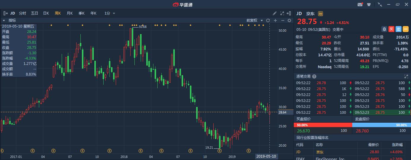 风雨之下,京东的股价也从2018年初最高50.68美元跌至11月最低的19.21美元,跌幅超过6成!
