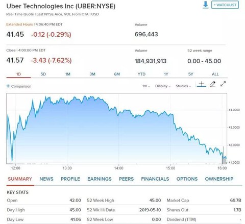 Uber上市首日收跌7.62%,报收41.57美元,盘后继续下跌,据彭博社统计,截至收盘市值跌破700亿美元,至697亿美元。