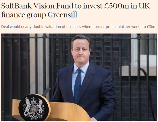 知情人士表示,软银愿景基金(SoftBank Vision Fund)将向英国私营金融公司Greensill投资5亿英镑,英国前首相戴维-卡梅伦(David Cameron)自离任以来一直担任这家公司的顾问。