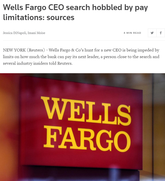 一位知情人士和几位业内人士表示,富国银行寻找新CEO的努力受到挫折,因该行支付给下任CEO的薪酬受到限制。知情人士说,少数几位顶级候选人已经表示,他们不会谋求这份工作,因为富国银行不太可能满足他们的薪酬要求。