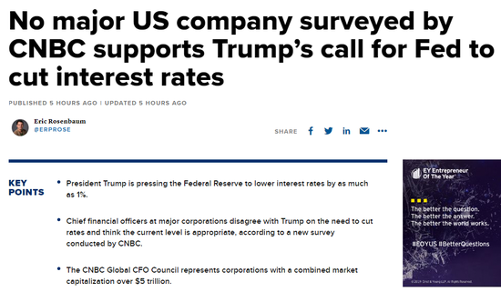 CNBC询问了美国和全球一些最大公司的首席财务官,他们是否同意特朗普有关降低当前利率的呼吁。全球只有4%的CFO赞同特朗普对美联储政策的看法,没有一个美国CFO同意特朗普再次降息的主张。