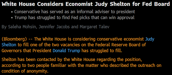 白宫正在考虑保守派经济学家朱迪-薛尔顿(Judy Shelton)来填补特朗普一直难以填补的美联储两个空缺之一。薛尔顿曾担任特朗普的非正式顾问,拥有犹他大学工商管理博士学位,主攻金融和国际经济。