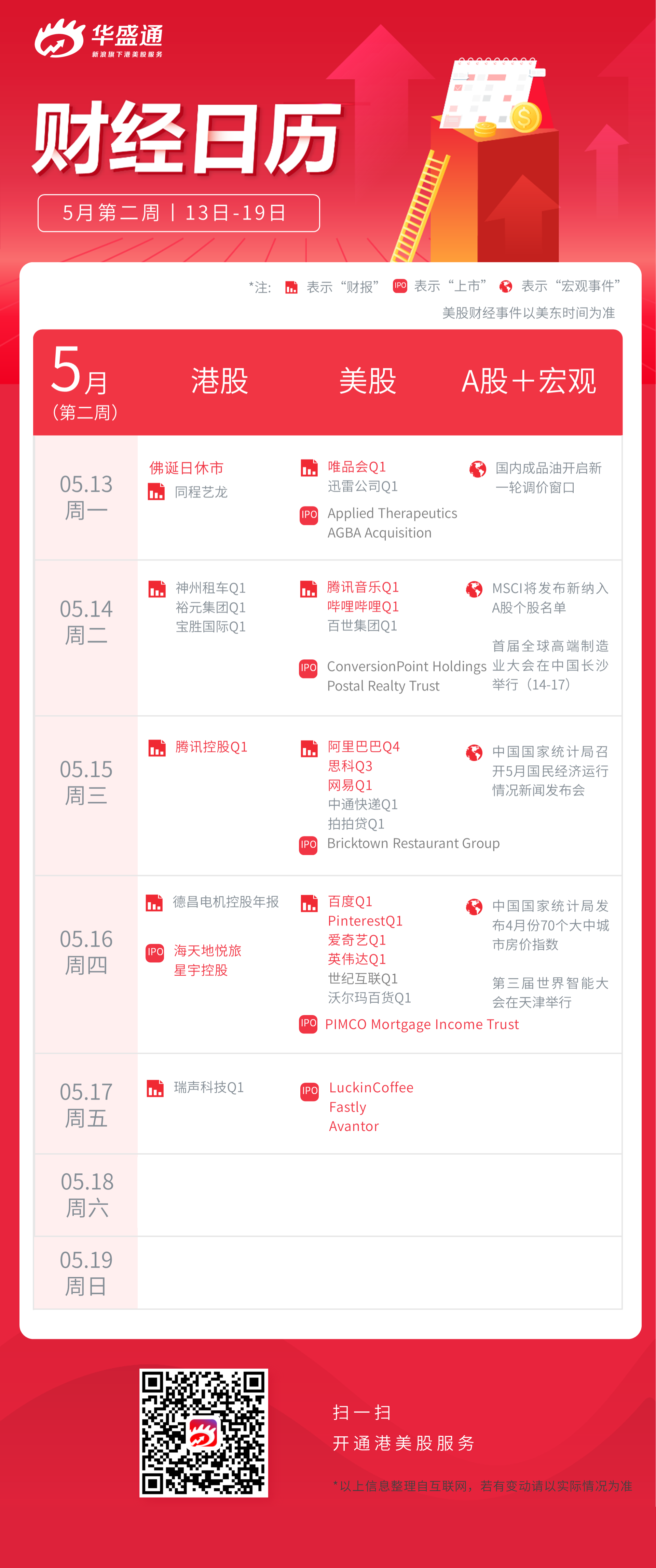 财经日历丨本周港美股、A股及宏观资讯一览