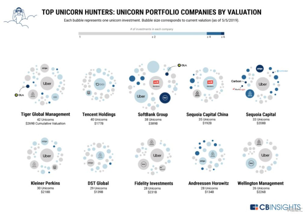 借助CB Insights的数据,我们得以一探究竟:哪些投资人“捕获”了最多的独角兽——以及,如果这些独角兽能够以其在私人市场的估值退出,又有哪些“独角兽猎人”可以占据C位,获得丰厚的投资回报。