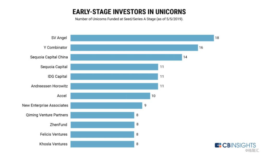 通过下面的列表可以看出,几家最高效的投资机构是:Y Combinator (18家独角兽中,16家是早期投资), SV Angel (23家独角兽中,18家为早期投资), 以及IDG资本 (18家独角兽中, 11家为早期投资)。