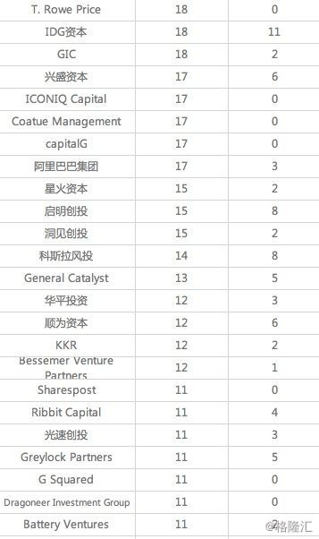 其它挺进前十的投资机构有:红杉中国( Sequoia Capital China)(35家),红杉资本(Sequoia Capital)(33家), Kleiner Perkins (30家), DST Global (29家), 富达资本(Fidelity Investments) (28家), Andreessen Horowitz (28家)以及威灵顿管理公司(Wellington Management ) (26家)。