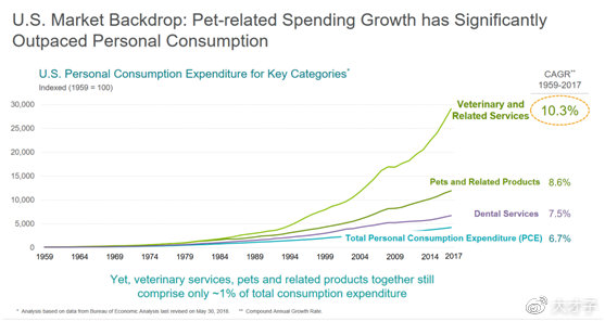 在美国人口有3.24亿,而根据宠物协会2015年数据来看,美国宠物仅猫狗就有1.6亿,其中狗有7780万只,猫有8580万只,而这些猫猫狗狗也会生病,这就拉动了美国宠物兽医行业的发展。不仅如此,大家有一种感受就是有些人花在自己宠物身上的钱比花在自己身上的还要多,他们真的把宠物当成自己的儿女一样愿意付出一切。