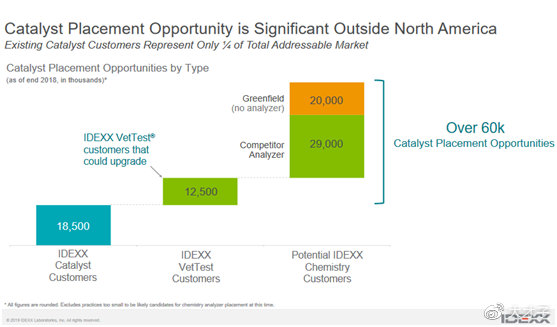 公司的模式就是向banfield和VCA这些宠物医院销售测试设备,耗材以及诊断服务收钱。而整个诊断过程大概就是30分钟。在美国,宠物消费是一个增长性行业,其中宠物健康领域增速高于行业平均,而诊断领域又高于整个宠物健康行业。Idexx又是行业中的龙头,CEO说公司在这领域的投资占据总市场投资的80%。目前美国应该是行业内全球最领先的,其他地区比如欧洲只有美国1/4的标准,所以还有很大的增长空间。同时在巴西人们拥有7500万只宠物,但是人们缺乏带宠物去宠物医院就诊的习惯,这也是一个非常大的潜在市场。