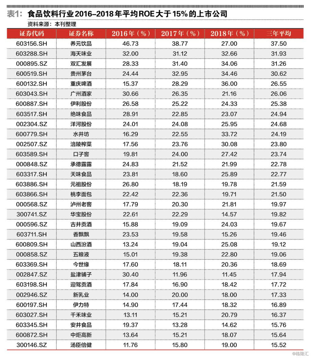 巴菲特就将ROE大于15%作为其投资的标准,其所投资的可口可乐、亨氏等具有代表性的食品饮料企业ROE均长期保持在30%以上。