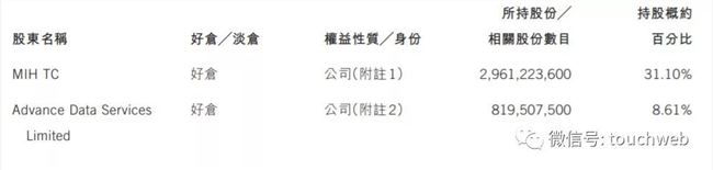 MIH TC为Naspers附属公司,在 2018 年 3 月曾按总价769. 4 亿港元出售共计189,978, 300 股腾讯股份,占已发行股份约2%。