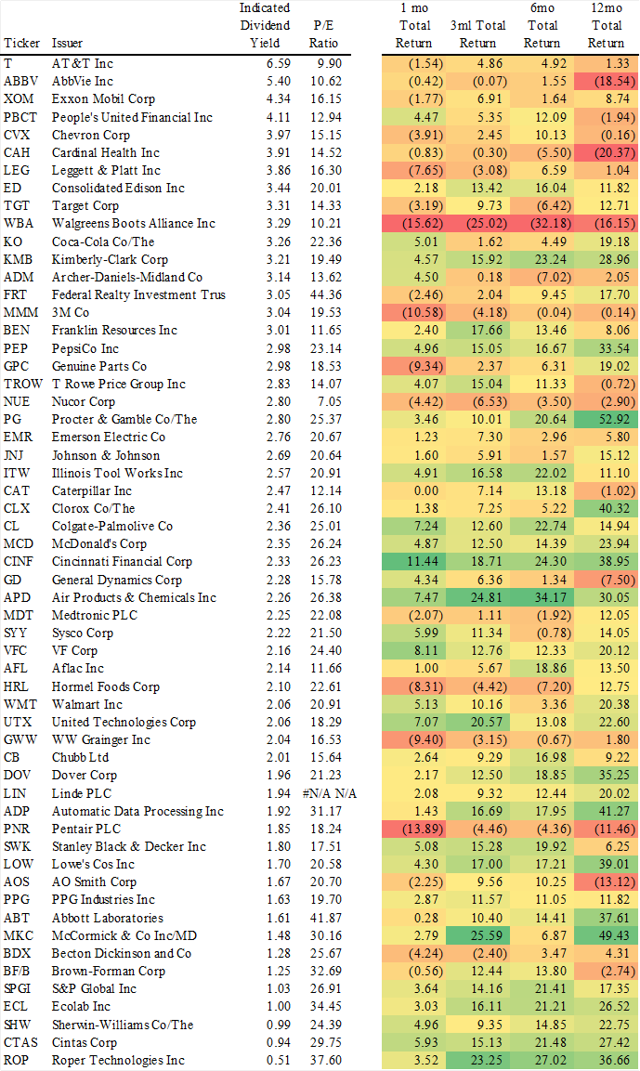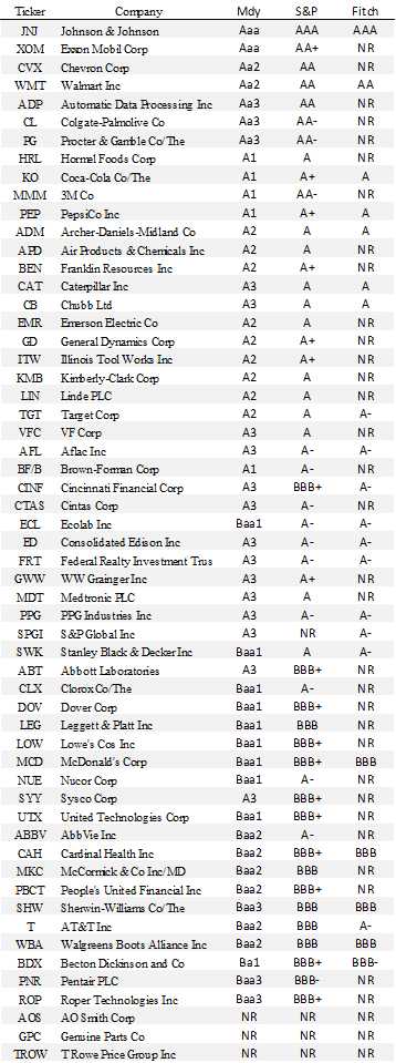 此外,一般股息率有随着评级下滑而下滑的趋势,只有AT&T和Abbvie是个例外。最低评级的几家公司:上面提到的碧迪、滨特尔(PNR)和儒博实业(ROP)(评级为低BBB级别)也仍保持2%的股息率。