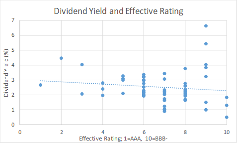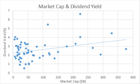 另一方面,从市值角度,公司规模越大评级似乎越高,股息贵族的市值与股息收益率似乎呈现正相关关系。