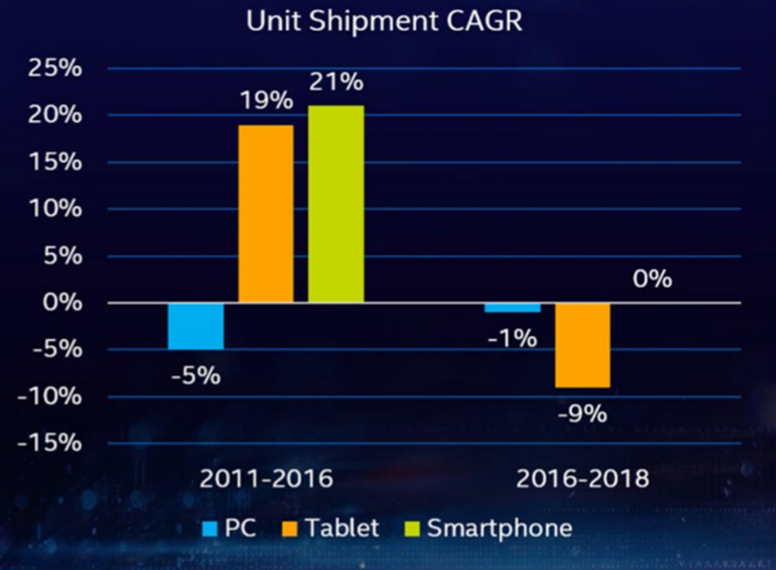 如下图所示,英特尔的核心业务PC市场已经萎缩了近十年。在此期间平板电脑和智能手机等新市场也出现了停滞或下滑。