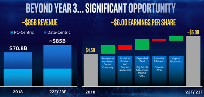 离2023年实现每股盈利6美元的目标还有5年时间,投资者可以期待一下。但英特尔所说的2021年后会有更大机遇的说法是值得怀疑的,因为几年后英特尔的知名度可能会降低,如何弥补在技术上的损失也不清楚。