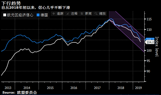 今年第一季度,欧元区GDP增长0.4%,超预期;预计周三欧洲第一大经济体德国也将公布类似的经济增长水平。这将暗示,经济前景并不像外界担心的那样糟糕,但要维系上行态势,很可能需要信心出现明显改善,从而提振投资和需求。欧盟委员会的一项信心衡量指标几乎持续不断地走低,自从2018年初以来已经下跌了9%。