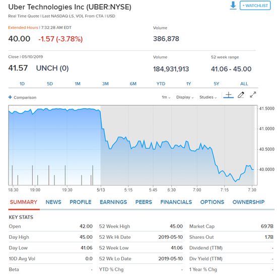 Uber上市第二个交易日,盘前跌4.5%,股价跌至40美元下方。