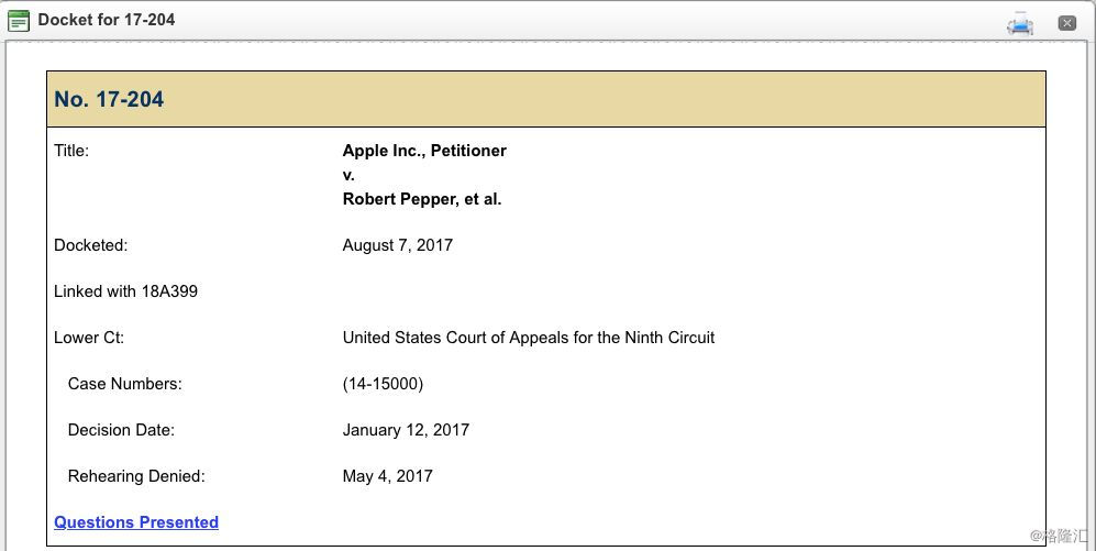 随后几年,这起案件出现反复:2014年,苹果胜诉;2017年初,第九巡回上诉法院又撤销此前判决。2018年,案件被提交到了美国最高法院的手中。
